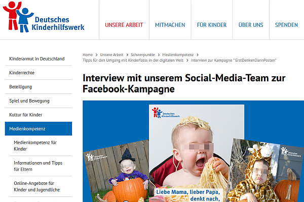 Als Reaktion auf das Ergebnis der Befragung hat das DKHW daher mit der Überschrift "Erst denken, dann posten" eine 3-wöchige Facebook-Kampagne durchgeführt. Bei Eltern und anderen Erwachsenen soll damit ein Bewusstsein für ihr Handeln geschaffen werden. Das DKHW spricht sich jedoch nicht für ein Internet ohne Kinderbilder aus. Die Organisation will allerdings zum Nachdenken anregen. Bevor ein Foto ins Netz gestellt wird, sollten folgende Fragen beantwortet werden: Würde ich so ein Foto auch von mir ins Netz stellen? Wer kann das sehen? Und ist mein Kind überhaupt damit einverstanden?
