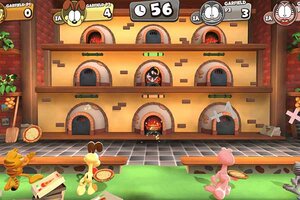 Screenshot aus dem Spiel "Garfield: Lasagna Party"; Bild: MicroidsDie Spielesammlung rund um den trägen und faulen Kater richtet sich in allererster Linie an jüngere Kinder. Ziel: Die meisten Lasagnen ergattern! Denn die sind bekanntlich Garfields Leibgericht...