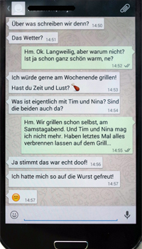 Wer sich aktiv in die WhatsApp-Gemeinde einreiht, wird mit einer gewissen sozialen Kontrolle konfrontiert: zum Beispiel über den Zeitstempel, der anzeigt, ob die Chat-Teilnehmenden online ist bzw. zu welchem Zeitpunkt er das letzte Mal online war. Hat jemand eine Nachricht gesendet und sieht, dass die andere Person online ist, ohne zu antworten, kann es zu Missstimmungen kommen. Die Möglichkeit, den eigenen Standort mitzuteilen, ist eine weitere Offenbarung, die in die Privatsphäre eines Nutzenden eingreift.
