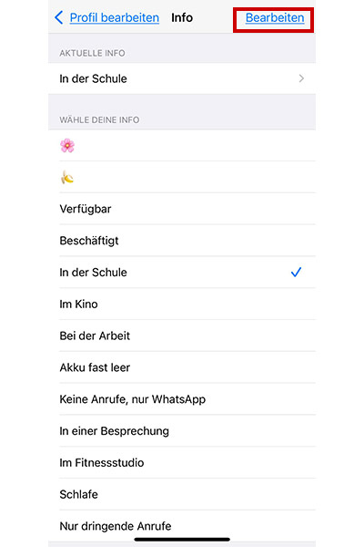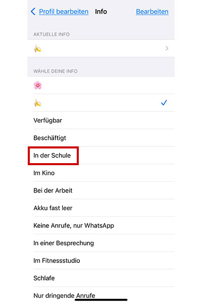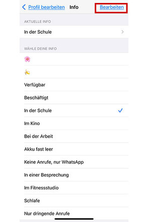 Die "Info" ist ein wichtiger Bestandteil des WhatsApp-Profils. Verwechseln Sie diesen Profil-Status jedoch nicht mit Ihrem WhatsApp-Status, über den Sie Ihre Kontakte auf dem Laufenden halten. Mit der "Info" können Sie mitteilen, ob Sie gerade verfügbar sind oder ob Sie nicht gestört werden möchten. Sie können aus verschiedenen Optionen wählen, wie z.B. "beschäftigt", "bei der Arbeit" oder "in einer Besprechung". Sie können auch einen eigenen Status eingeben. Standardmäßig ist die Info "Hallo! Ich benutze WhatsApp." oder "Hey there! I am using WhatsApp." voreingestellt.
