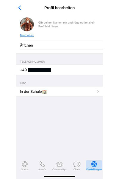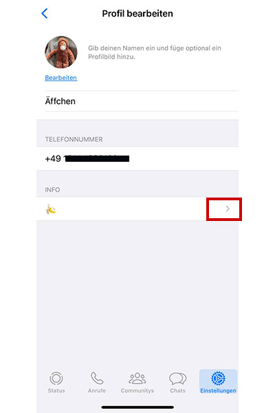 Ihre "Info" ist an verschiedenen Stellen auf WhatsApp sichtbar. Andere Personen sehen Ihren Status, wenn sie Ihr Profil aufrufen. Man kann Ihren Profil-Status auch oberhalb des Chatverlaufs sehen, wenn man auf Ihren Namen tippt. Sie können die Sichtbarkeit Ihrer "Info" in den Privatsphäre-Einstellungen einschränken.