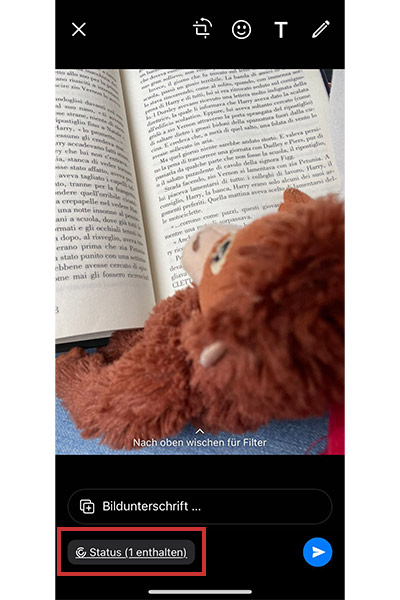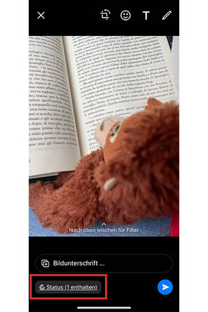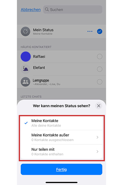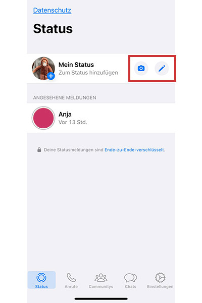 Wenn Sie ein Foto als Status erstellen wollen, wählen Sie ein Bild aus ihrer Galerie aus oder machen Sie direkt ein neues Foto. Anschließend können Sie einstellen, wer den Status sehen darf.