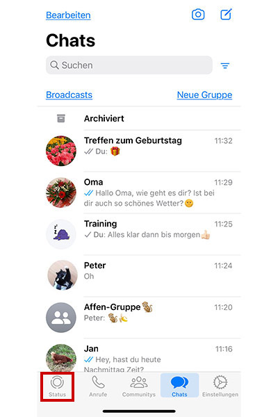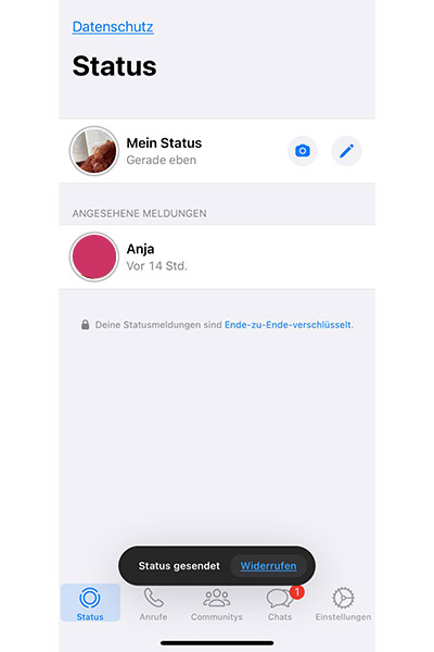 Der WhatsApp-Status ist vergleichbar mit Instagram- oder Facebook-Stories: In kurzen Status-Updates kann man Text, Emojis, Fotos, Videos und animierten GIFs versenden. Der WhatsApp-Status wird normalerweise für einen Zeitraum von 24 Stunden angezeigt, bevor er automatisch aus der App entfernt wird, es sei denn, man aktualisiert oder ändert den Status.