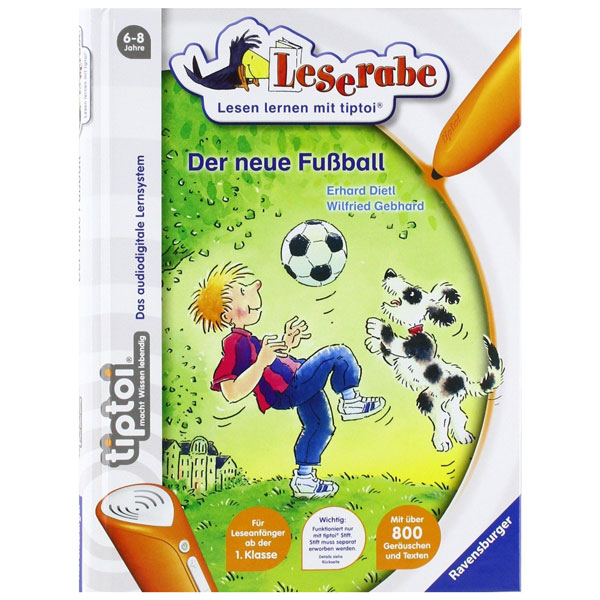 Ein Konzept, das zum Beispel beim Titel "Der neue Fußball" aus der Reihe Leseraben wunderbar aufgeht. Denn diese Geschichte um den kleinen Tommi und das runde Leder können die Kinder sich zum einen vorlesen lassen, sie können sie aber auch selber lesen und – was besonders interessant ist – mit dem tiptoi entdecken. Der orangefarbene Stift mit Lautsprecher liest auf Wunsch die gesamte Geschichte vor. Oder er beschränkt sich auf ausgewählte schwierige oder besondere Wörter. Die werden dann vom sympathischen Leseraben auch noch mit weiteren Erklärungen versehen.