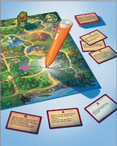 Hier geht es einmal nicht um den Wettkampf, sondern um das gemeinsame Agieren. Auf die Spieler warten in diesem Lesedschungel jede Menge gefährliche Aufträge. Haben sie sich für eine der insgesamt 15 Missionen entschieden, dann kommt der digitale Stift tiptoi zum Einsatz. Er liest die Aufgabe vor und ordnet den Spielern die passenden Aufgabenkarten zu.