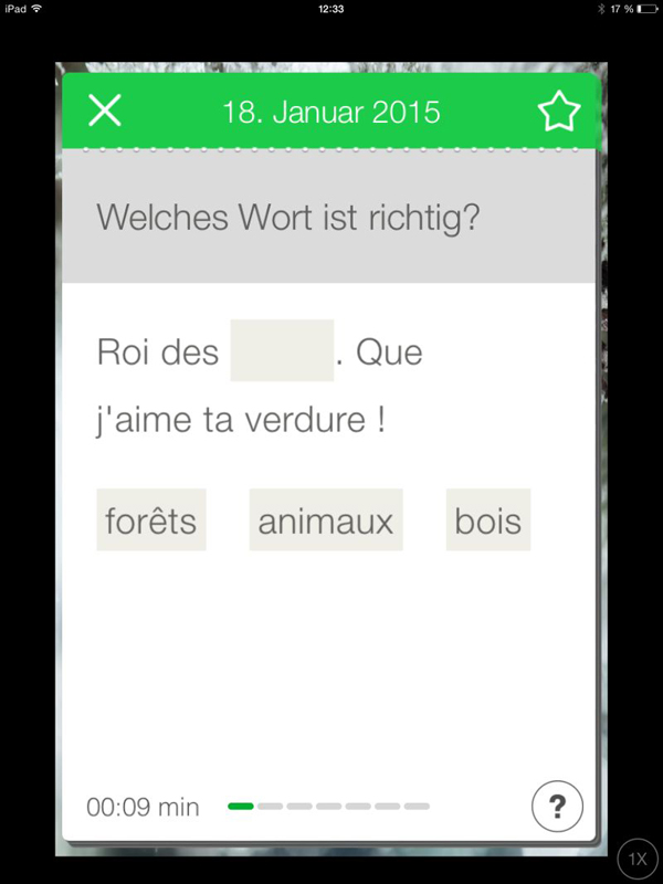 Fünf Minuten pro Tag Sprachen lernen? Das sollte kein Problem sein, haben sich wohl die Macher dieser App gedacht. Herausgekommen ist ein Sprachlern-Angebot, das Spaß macht und tatsächlich zu Lernfortschritten führt. Hangman, Lückentext, Multiple Choice, Odd on out ("Welcher Begriff passt nicht in die Reihe?"), Match ("Welche Begriffe gehören zusammen?"), Memo-Spiel oder Zitat des Tages – die verschiedenen Spiele sorgen für dauerhaftes und vergnügliches Vokabellernen.