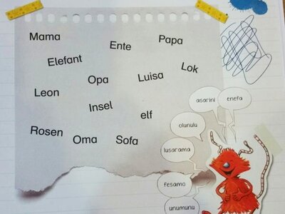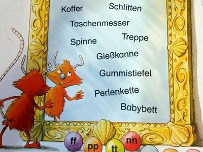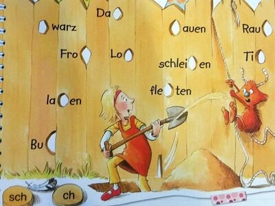 Gemeinsam mit dem roten Kritzelmonster erproben die Kinder hier erstes Lesen und Schreiben. Unterstützt werden sie dabei von der Anlauttabelle am Ende des Buches, die einfach ausgeklappt werden kann. Damit werden anfangs die Anlaute und Auslaute gesucht oder die Laute im Wort.