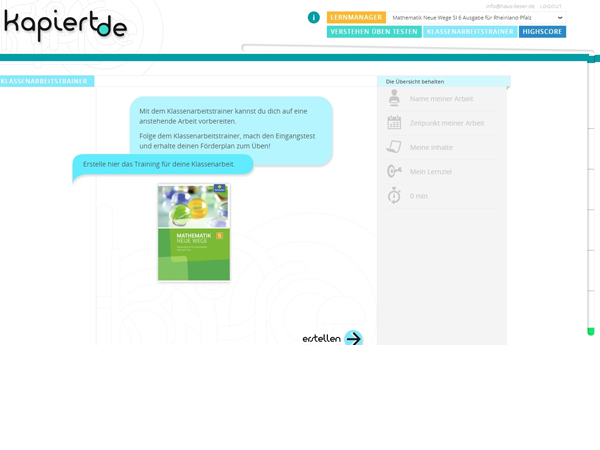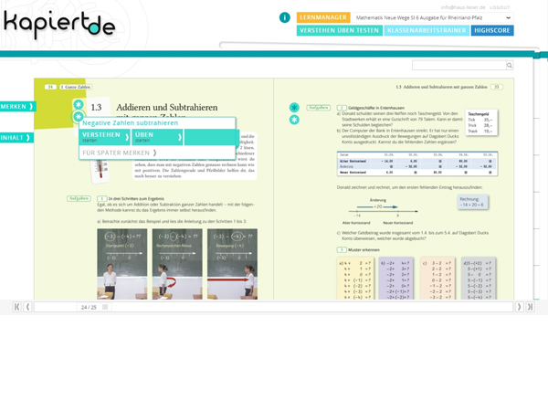 Herzstück des kombinierten Buch-, Online- und App-Angebots ist die Seite kapiert.de. Die Inhalte können einfach durchgearbeitet werden oder nach dem Prinzip verstehen, üben und testen "erlernt" werden. Denn auf den einzelnen Buchseiten werden zusätzliche Übungen zur Vertiefung, interaktive Erklärungen und Tests angeboten und machen aus dem Schulbuch einen multimedialen Lernbegleiter.