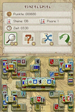 Das zweite Spiel in diesem Bundle heißt "Mahjong - Eine Reise um die Welt" und bietet neben dem traditionellen Einzelspiel auch Turniere, einen Zweikampf und "klassische" Variante an. Außerdem können die Spieler hier eigene Spielbretter entwerfen und anschließend damit spielen. Beim Zweikampf teilt man sich den Bildschirm eines Gerätes mit einem Mitspieler und zieht abwechselnd innerhalb einer vorgegebenen Zeit. Alternativ kann man auch gegen den Computer antreten. Dann findet das Spiel simultan auf der rechten und linken Seite des Bildschirms statt. Beim klassischen Spiel ist die Anzahl der Steine eingeschränkt.