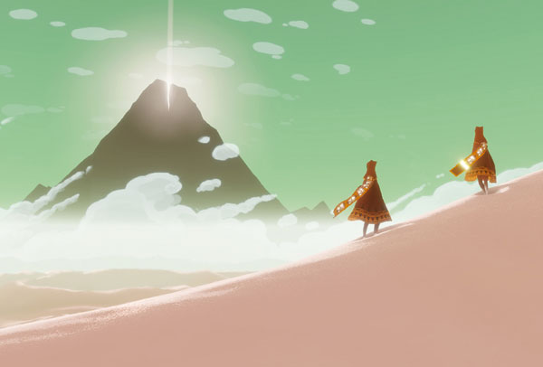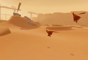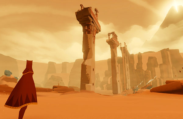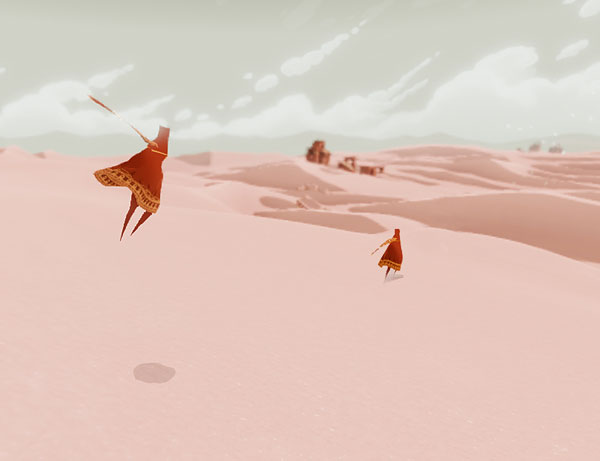In "The Journey" ist nichts wie in anderen Games. Die Spieler reagieren zunächst einmal perplex: Denn es wird weder eine Geschichte erzählt, noch gibt es Anleitung, Aufgabe oder Ziel. Nur mit Hilfe der Bildsprache wird einem verdeutlicht, dass es auf einen Berg mit einer riesigen Spalte zugehen soll. Dazu wird ein Nomade auf Streichholzbeinen durch die Wüstenlandschaft gesteuert. Manchmal gleitet er sogar auf den Dünen wie ein Surfer auf dem Wasser. Wer die Orientierung verliert, schaut sich in aller Ruhe um. Nicht selten locken Ruinen in der Ferne oder vermeintlich flatternde Vögel am Horizont ...