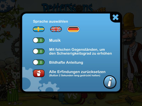Von Erfindung zu Erfindung arbeiten sich die Spieler von ganz einfachen Aufgabenstellungen zu immer schwierigeren Herausforderungen nach oben. Begleitet werden sie dabei von Pettersson und Findus, die charmant mit einem leichtenschwedischen Akzent die Aufgaben stellen. Auf Wunsch sprechen die beiden auch Englisch und Schwedisch.
