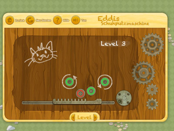 Dumm nur, dass Eddi mit dem Bau der Maschine nicht ganz fertig ist. Also müssen die jungen Spieler in zehn verschiedenen Leveln Zahnräder so zusammensetzen, dass diese den Schieber der Maschine in die richtige Richtung bewegen. Was anfangs noch ein echtes Kinderspiel ist, wird nach und nach immer schwieriger. Aber mit der nötigen Tüftelausdauer erreichen die Spieler gewiss ihr Ziel und haben nebenbei noch einiges über Antriebswellen, Steckachsen und Drehrichtungen gelernt.