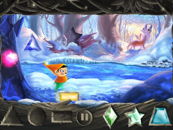 Geschickt sind die "Fußstapfen" der Edelsteine in die Bilder integriert. Und man muss schon genau hinsehen, um sie zu finden. Mal sind sie in einer Baumrinde versteckt, mal im Schnee oder über dem Kamin. So reisen die Spieler von Winterlandschaft zu Winterlandschaft. Vom verschneiten See über den Winterwald in das Schloss, in die Eishöhle, in das Waldhaus oder in den blauen Nachtwald bis zum Winterdrachen.