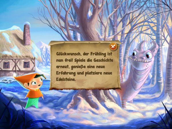 Wer gut aufpasst, kann den Drachen bereits im ersten Kapitel im Hintergrund jenseits des Sees entdecken. Er ist also noch ziemlich weit entfernt. Jeweils sechs Edelsteine aus verschiedenen Formen – das können etwa ein Stern, ein Quadrat, ein Herz oder ein Dreieck sein – befinden sich am unteren Bildrand. Sie müssen in jedem der zehn Kapitel an ihren passenden Platz im Bild bugsiert werden.