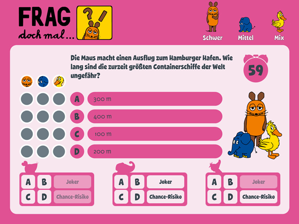 Witzig: Die App "Frag doch mal die Maus" sieht eigentlich wie ein Brettspiel aus: Hier wird sich würfelnd vorwärts bewegt. Aber nicht der Spieler gewinnt, der als erstes ins Ziel findet, sondern wer oft und geschickt zurückkehrt, um möglichst viele Punkte zu kassieren.