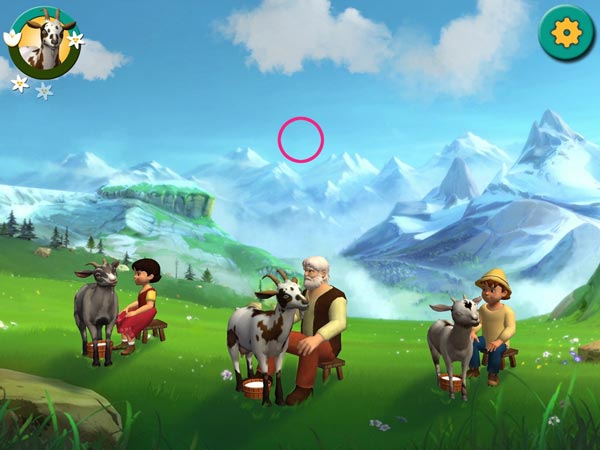 Das Spiel beginnt mit einer Übersichtsseite mit Heidi, Peter, dem Großvater, Bernhardiner Josef und einer Ziege. Hinter den Figuren verstecken sich kleine Minispiele.