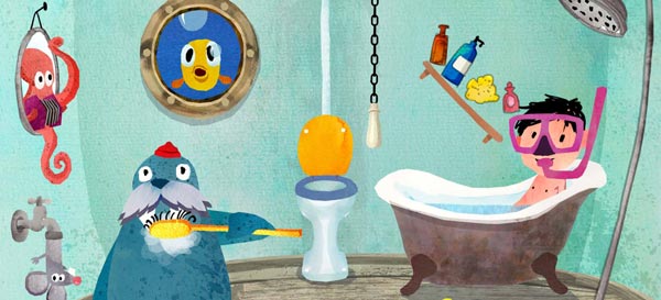Im Badezimmer schrubbt das Walross seine Zähne im Takt - mal langsam, mal schnell. Und die Gummi-Ente kann nicht bloß tauchen, sondern auch muhen. Der Oktopus spielt Ziehharmonika und der Klodeckel klappert im Takt, während der Junge in der Badewanne singt. Weitere Protagonisten in diesem ungewöhnlichen Badezimmer sind unter anderem eine Giraffe, eine Maus und ein U-Boot.