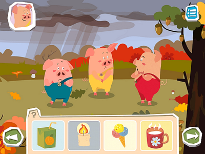 Die bekannte Geschichte von den drei kleinen Schweinchen wird hier neu und interaktiv präsentiert. Niff-Niff, Nuff-Nuff und Naff-Naff leben fröhlich in der Natur, bis es immer kälter wird. Der Winter steht vor der Tür. Während Naff-Naff sich mit großer Mühe ein Haus aus Stein mauert, spielen die beiden anderen Schweinchen lieber weiter und schustern sich dann im letzten Moment ein Haus aus Stroh und eins aus Holz zusammen.