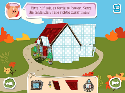 Das war nicht sehr klug, denn für den Fuchs sind solche Häuser kein Hindernis. Klar aber, dass die Geschichte schließlich doch noch gut ausgeht. Sie wird in einzelnen kleinen Szenen erzählt, angereichert mit Zusatzfragen und kleinen Spielen, in denen es um Größen, Gewichte oder Farben geht. Die Kinder können die Geschichte selbst lesen (was bei der Zielgruppe aber eher unwahrscheinlich ist) oder sich den Text vorlesen lassen.