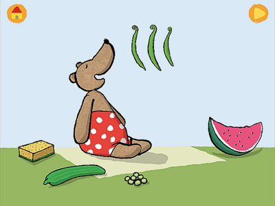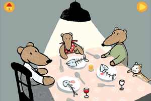 Die Geschichte von dem kleinen Bärenmädchen beginnt mit kleinen Klecksen. Auf einen kurzen Fingertipp öffnet sich das Setting: Emma sitzt mit ihrer Familie am Esstisch. Dazu erklingt der Reim: "Alle essen heute Fisch, mit den Pfoten auf dem Tisch." Berühren Kinder anschließend die Fische auf dem Teller, beginnt das Mahl.