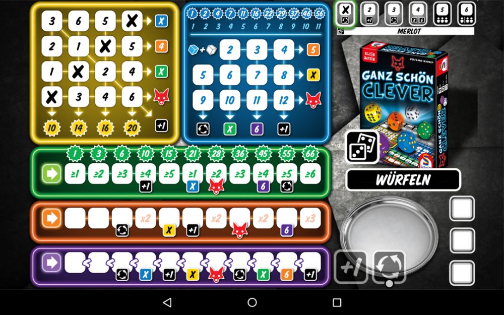 Dazu gesellen sich noch etliche Aktionen wie etwa eine Nachwürfelaktion oder eine Zusatzwürfelaktion, die jeweils mit entsprechenden Buttons angezeigt werden. Außerdem sorgen noch einige Bonusangebote für zusätzliche Punkte. Etwa der Fuchs oder der X- bzw. Zahl-Bonus, mit dem das nächste Feld zusätzlich gefüllt wird.