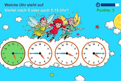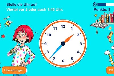 Wie verhält es sich mit Minuten, Viertelstunden oder ganzen Stunden? Mit dieser App üben Grundschulkinder die Zeit abzulesen (bei digitalen und analogen Ziffernblättern) oder genau zu bestimmen, wie viel Zeit vergangen ist.
