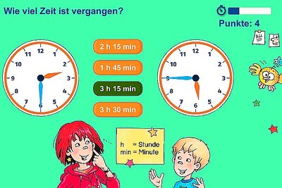 Wie verhält es sich mit Minuten, Viertelstunden oder ganzen Stunden? Mit dieser App üben Grundschulkinder die Zeit abzulesen (bei digitalen und analogen Ziffernblättern) oder genau zu bestimmen, wie viel Zeit vergangen ist.