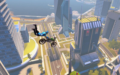 Trials Fusion ist ein Rennspiel, bei dem der Spieler mit einem Motorrad durch schmutzige Wildnis, aber auch über blitzsaubere futuristische Straßen, die von gläsernen Wolkenkratzern eingerahmt werden, fährt.