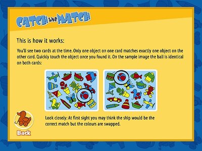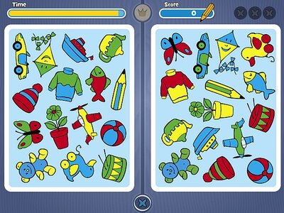 In diesem Suchspiel gibt es auf einer Seite des Screens Bälle, Mützen, Segelboote, Autos und andere Dinge zweifarbig. Auf der gegenüberliegenden Seite sind die selben Gegenstände, nur anders angeordnet. Nun gilt es, den Gegenstand zu finden, der farblich aus der Reihe tanzt. Ein Ding weist eine andere Farbkombination aus. Nur welches? Und wo? Gar nicht so leicht, das zu entdecken. Außerdem läuft die Zeit.