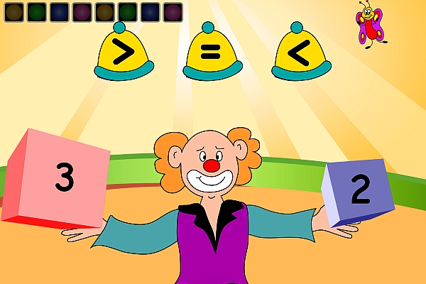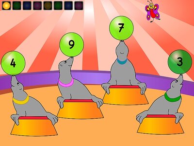 Zunächst sollen die Bälle der beiden Jongleure gezählt werden. Sympathisch: Das kann mit bloßem Auge geschehen, aber für Ungeübte erscheinen auf Antippen der Bälle auch die entsprechenden Zahlen. Danach sollen Zahlen entsprechend ihrer Größe sortiert oder mit dem Clown verglichen werden. Das geschieht zum Teil auch in Geschicklichkeitsspielen. Also entweder Bälle nicht neben dem Trampolin fallen lassen oder beim Hütchenspieler die gesuchte Zahl gut im Auge behalten.