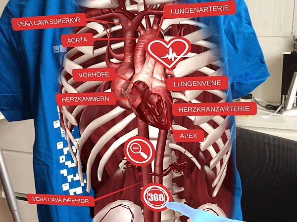 Augmented Reality-Effekte zeigen auf dem Bildschirm in plastischer 3D-Anmutung wahlweise Blutkreislauf, das Herz, das Skelett oder das Verdauungssystem und die Harnwege. Ein Sprecher liefert zu jedem Thema tiefergehende Informationen. 360 Grad-Reisen sorgen für weitere beeindruckende Bilder einer Körperreise.