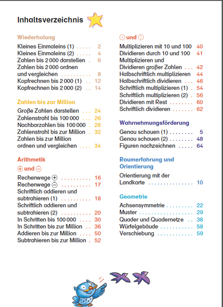 Hier geht es schon um Zahlen bis zu einer Million, um Geometrie – etwa um die Achsensymmetrie –, um Orientierung mit Landkarten und um das Kopfrechnen. Sicherheitshalber wird noch einmal das kleine Einmaleins geübt, werden Zahlen zerlegt und geordnet. Doch dann geht’s ans Kopfrechen in Tausenderbereichen, um Quadernetze und Würfelgebäude.