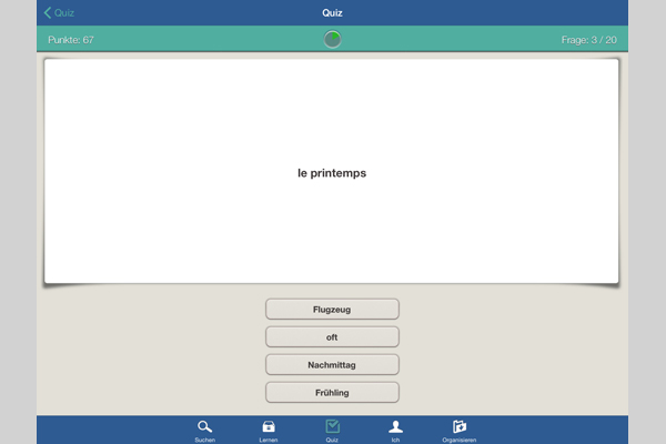 In zwölf Kategorien – von "Bienvenue" bis "Les loisirs" werden die Vokabeln auf traditionellen Vokabelkärtchen präsentiert und vorgelesen. Einmal umdrehen - und die französische Übersetzung erscheint und wird ebenfalls vorgelesen. Jetzt kann angekreuzt werden, ob die Vokabel "sitzt" und ob man sie in seine Favoriten übernehmen möchte – das sind dann die Vokabeln, die man sich besonders merken oder noch einmal vornehmen möchte. Außerdem lassen sich beliebig viele eigene Vokabelkarten anfertigen und im Quiz lässt sich das Gelernte direkt anwenden.