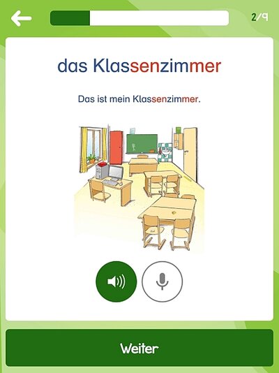 Die einzelnen Wörter werden vorgelesen, in Sätze integriert und später mit verschiedenen Verfahren - Multiple Choice oder Memory - wieder abgefragt. Die Kinder können ihre Antworten auch in das Mikrofon sprechen.