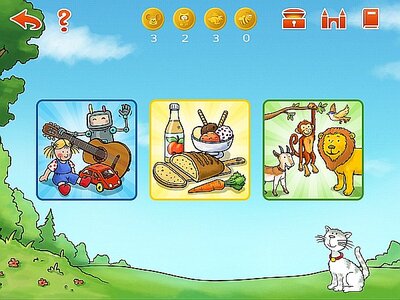 Mit Conni und Tom lernen Kinder hier ihre ersten englischen Vokabeln. In insgesamt drei Szenarien suchen sie verschiedene Objekte: im Kinderzimmer, in der Küche und bei den Tieren.