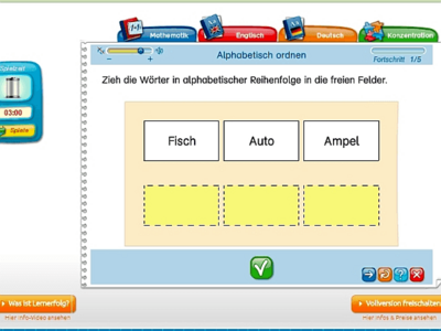 Für Kinder in den Klassen 1 bis 4 werden bei "Lernerfolg Grundchule" die Fächer Deutsch, Englisch und Mathematik angeboten. Außerdem können die jungen Lerner ihre Konzentrationsfähigkeit trainieren. Der kleine Vampir Freddy, der schon aus der gleichnamigen Lernsoftware bekannt ist, begleitet durch das Programm.