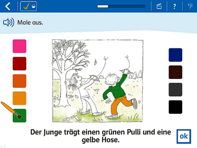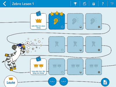 Sie spielen Satzangeln oder malen Bilder nach einem vorgegebenen Text aus. Dabei geht es in erster Linie um das Lesen von zwei- und dreisilbigen Wörtern, angeboten werden Substantive und Verben. Je nach Erfolg wachsen die Lernanforderungen, für erfolgreiches Üben gibt es Sterne und Pokale.