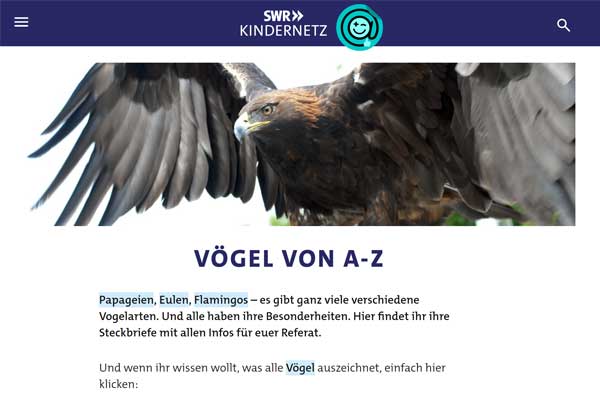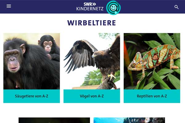 Hier gibt es tatsächlich jede Menge zu stöbern und zu lernen. Die Kinder können entweder über die A-Z-Suche oder nach verschiedenen Arten (Fische, Gliedertiere, Säugetiere, Vögel usw.) und Kategorien (Zugvögel, Wüstentiere, Waldtiere oder Tiere auf dem Bauernhof) recherchieren.