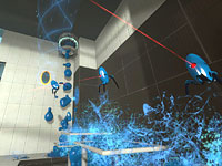 Ein Beispiel: Wenn der Spieler aus einem Loch mit großer Wucht fallen will, um einen langen Abgrund zu überwinden, muss er geradewegs ein zweites Loch in den Abgrund schießen und dann mit großem Karacho hineinstürzen, um so die Kraft für den Flug zu erhalten. Später kommen noch weitere Elemente hinzu: Blaue Farbe hilft beim Springen, auf einem Lichtstrahl kann gelaufen werden und auf orangener Farbe vermag der Spieler mit einem Höllentempo zu rutschen. Ab und zu stehen kleine Roboter herum, die mit ihrem Laserstrahl töten können. Uns aber bleibt nur die Portalkanone und die eigene Intelligenz, um diese lästigen Figuren auszuschalten, ohne selbst auf sie schießen zu können.