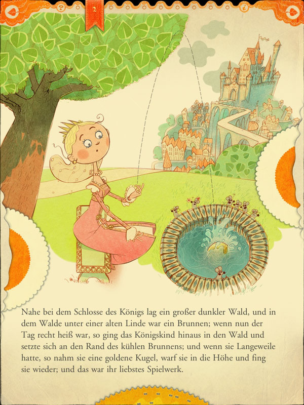 Da müssen zum Beispiel in einem Wimmelwaldbild alle Waldtiere gefunden werden oder die Frösche sammeln mit einem schnellen Fingerwisch möglichst viele Kronen. Rotkäppchen schließlich findet nur den Weg zu Großmutters Haus, wenn das iPad so hin- und hergekippt wird, dass die Protagonistin auch auf ihrem Weg bleibt.