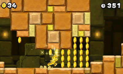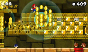 Sobald sich Mario in einen Goldmario verwandelt, transformieren sich auch alle Mauersteine zu Goldmünzen, die es nur noch einzusammeln gilt. Böse Zungen behaupten an der Stelle, dass der Mangel an neuen Ideen im zweiten Bros-Teil hauptsächlich durch das Einheimsen von Goldmünzen kompensiert wird. Allerdings gehörte das Münzeneinsammeln ja immer schon bei dieser Art von Spiel dazu. Doch diesmal strömen, regnen und prasseln die Penunzen nur so in rauen Mengen auf die Spieler ein. Dann gibt es noch die Goldboxen. Wer die im richtigen Moment anspringt, erhält genau die angezeigte Zahlenmenge an Münzen. Und schließlich setzt sich Mario auch gerne mal ein Goldquadrat auf den Kopf, das bei jedem Hops Goldmünze um Goldmünze ausspuckt ...