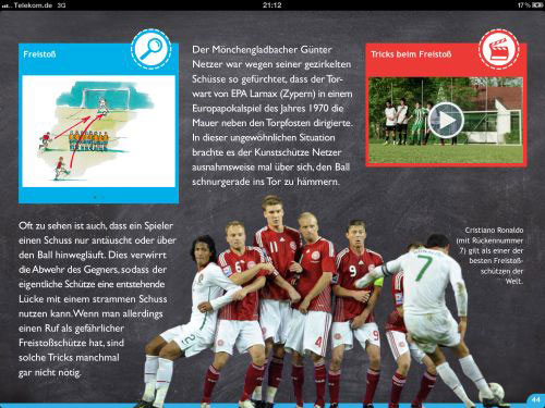 Außerdem kann man sich in Ruhe anhören, warum eigentlich elf Spieler eine Mannschaft bilden oder wie es mit der Aufgabenverteilung auf dem Spielfeld ausssieht. Texte, Bilder, Videos und Audios laden immer wieder zum Stöbern und Staunen ein. So muss ein E-Book für wissenshungrige Kinder und Jugendliche gemacht sein.