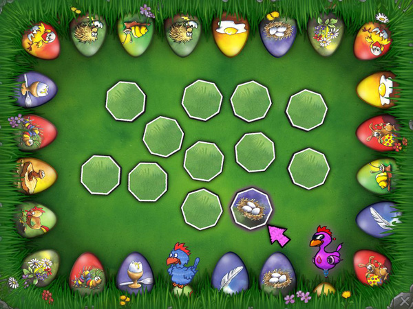Wie bei einem Memory gilt es, identische Kärtchen zu finden. In diesem Fall muss man jeweils das Gegenstück des vor einem liegenden bunten Eises finden, um weiterzuziehen. Gelingt es sogar, ein anderes Huhn zu überholen, dann darf man ihm alle Federn abnehmen und sich selbst damit schmücken.