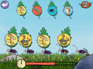 Nacheinander krabbeln die Käfer auf ihrem Käfermarsch über den Bildschirm. Jeder von ihnen trägt ein Symbol auf seinem Rücken - bis auf einen. Schnell müssen die Kinder das fehlende Symbol aus einer Bildreihe heraussuchen und dem Käfer zuordnen. Das können Formen, Zahlen, Buchstaben oder auch Abbildungen der verschiedenen Protagonisten aus dem Buch sein. Im Laufe des Spiels steigt die Anzahl der Käfer und die Aufgaben variieren stark. Mal geht es um gleiche Symbole, mal muss eine Reihe fortgesetzt oder auf die passenden Farben geachtet werden.