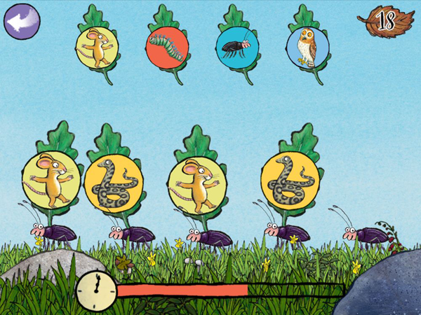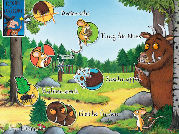 "Grüffelo: Spiele" heißt sie ganz schlicht und beschreibt so auch, worum es geht: Nicht die Geschichte der beiden Kinderbuch-Stars wird erzählt - es wird einfach nur gespielt. Aber als Protagonisten treten die beiden immer wieder in den verschiedenen Spielen in Erscheinung. Und diese kommen zunächst - wie "Puzzle", "Dreierreihe" oder "Gleiche finden" - ganz traditionell daher. Schnell zeichnen sie sich aber durch ihre pfiffige Umsetzung und die sanft ansteigenden Schwierigkeitsgrade aus.