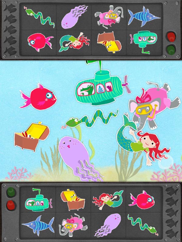Spannender wird das Ganze allerdings beim gemeinsamen Spiel, dann nämlich, wenn zwei Spieler gegeneinander antreten. Dazu wird das Tablet wie ein Spielbrett auf den Tisch gelegt. Jeder der beiden Spieler hat nun ein eigenes Schaltbrett. Jetzt geht es darum, wer als Erster den gesuchten Gegenstand antippt und den goldenen Fisch ergattert ...