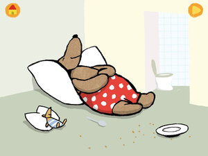 Und nach all diesen Essereien folgt eins: ein tiefer Schlaf. All diese Szenen werden von den Kindern erst freigewischt. Denn anfangs erscheint nur ein einziger Punkt. Der muss berührt werden und nach weiterem Wischen erst werden die Szenen komplett. Auch in den einzelnen Bildern, die jeweils mit den passenden Reimen vertont sind, gibt es Etliches, was in Bewegung gewischt werden will. Zum Schluss ist es der Bauch der schlafenden Emma, dann folgt nach all dem Schlemmen ein befreiender Pups ...