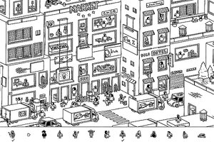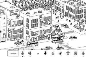 Diese App führt uns in eine Welt mit handgezeichneten, detailverliebten Schwarzweißmotiven, in denen ständig Bewegung herrscht. Das ist auf den ersten Blick recht ungewöhnlich. Aufgabe ist es, in verschiedenen Wimmelszenarien bestimmte Figuren oder Gegenstände zu finden.
