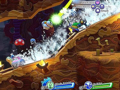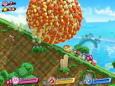 Soweit, so bekannt. Seitdem ihn aber ein rosafarbenes Herz getroffen hat, erlangt der Held ungeahnte Möglichkeiten. Nun kann er seine Gegner zu Freunden machen und hat schnell ein Gefolge beisammen. Das unterstützt ihn mit den verschiedensten Fähigkeiten, mit dem Schwert, mit einer Bombe, mit Feuer oder Eis. Besonders cool: Kirby und die anderen können ihre Waffen upgraden, dann wird schnell aus dem Schwert ein Brutzelschwert oder aus Wasser und Eis eine Zapfenlanze.