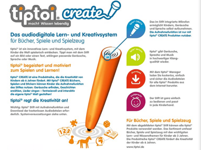 Mit dem Geräusche-Sammler Tom und dem Create-Stift beschreitet das interaktive Lesen jetzt jedoch das nächste Level: Neben der Geschichte rund um die Weltreise gibt es zahlreiche kleine Figuren und Tiere, die mit einer eigenen Tonspur belegt werden dürfen. Dafür fertigen Kinder mit dem tiptoi-Stift eine eigene, jederzeit wieder abspielbare Sprachaufnahme an.